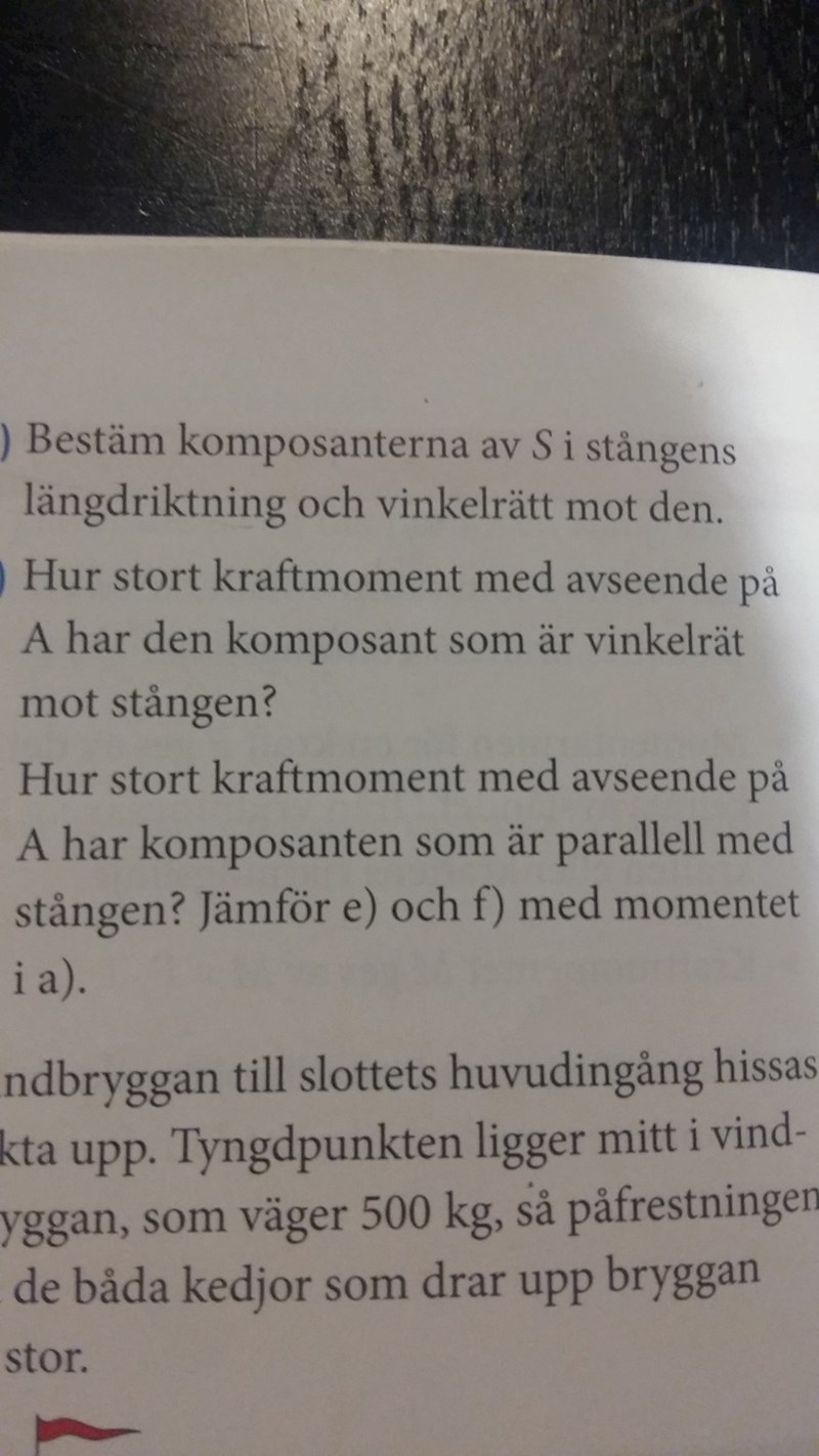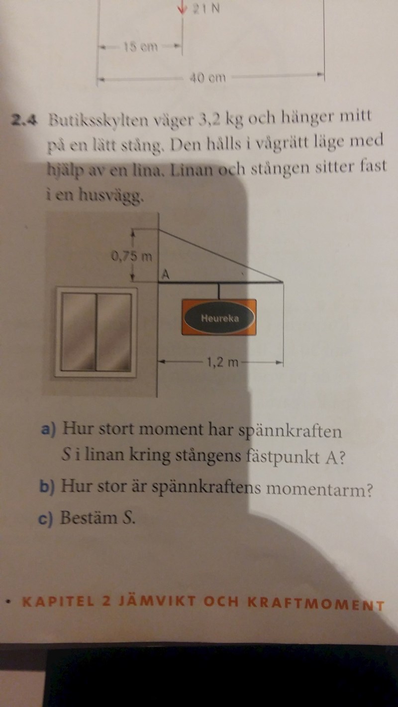 Uppgift b. Jag förstår inte frågan. Har tittat på lösning där man med linjal vinkelrät till linan drar ett sträck till A (som i min bild). Förstår inte varför momentarmen ska vara just där.
