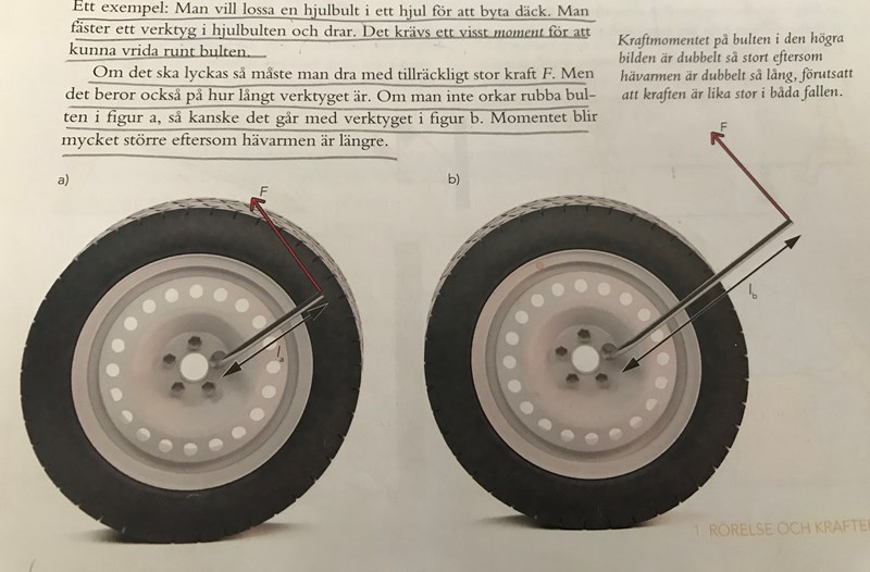Iaf, jag behöver hjälp med att förstå detta som står i min fysikbok. Det jag inte förstår är att om hävarmen är dubbelt så lång och kraften lika stor i båda fallen - blir det då lättare för mig lossa en hjulbult för det de säger är att kraftmomenten är dubbelt så stor men jag fattar inte vilken kraft det är.