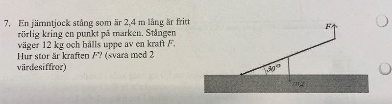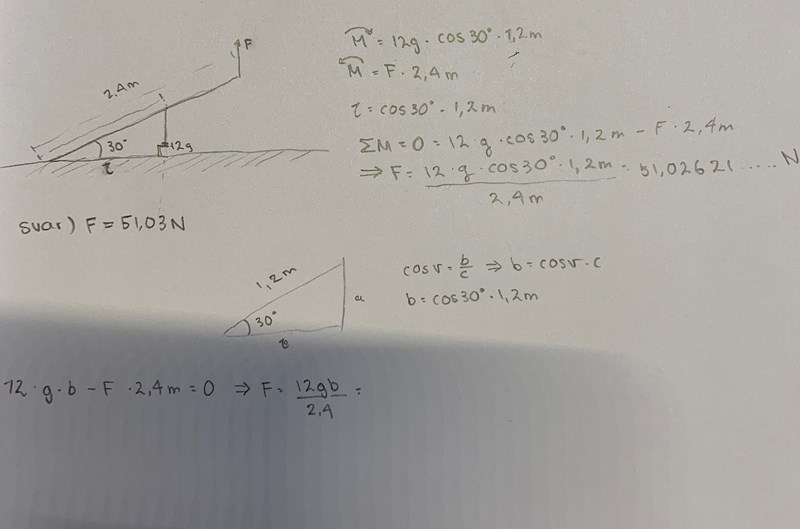 För att det är ett av lärandemålen i kursen att eleven ska lära sig formulera momentekvationen, inte bara direkt hoppa till svaret. Det är lite mer bakom uträkningen egentligen än dina snabba svar. Först och främst måste man beräkna momentet kring stångens fästpunkt O i marken så att reaktionskrafterna där har nollmoment. Sedan ställer man upp: