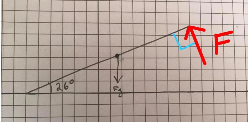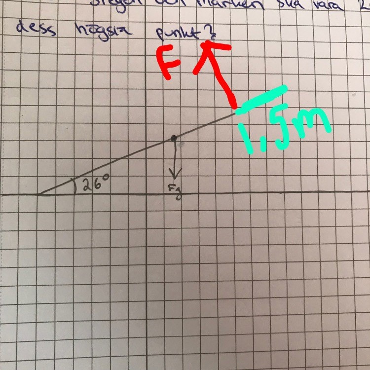 Det står att vinkeln mellan marken och stegen skall vara 26 grader. Det står (mellan raderna) att avståndet (mätt längs stegen) mellan marken och den punkt där kraften verkar är 3 meter. Då har du två krafter, en som försöker vrida stegen medurs (p g a gravitationen) och en kraft som vill vrita moturs. Stegen skall vara i vila.