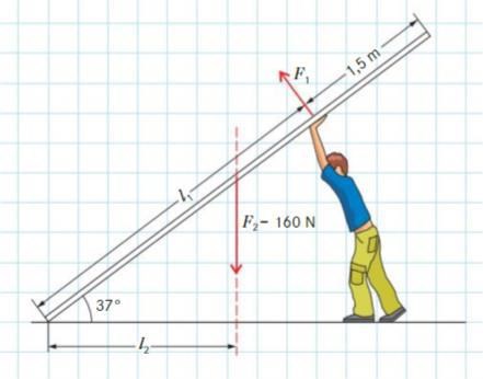 En stege är 4,5m lång och har tyngden 150 N. Tyngdpunkten är mitt på stegen. Hur stor kraft vinkelrätt mot stegen behövs för att vinkeln mellan stegen och marken ska vara , om man stöder stegen 1,5 m från dess högsta punkt?