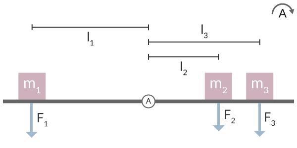 summan av kraftmoment: -m1l1+m2l2+m3l3 = 0