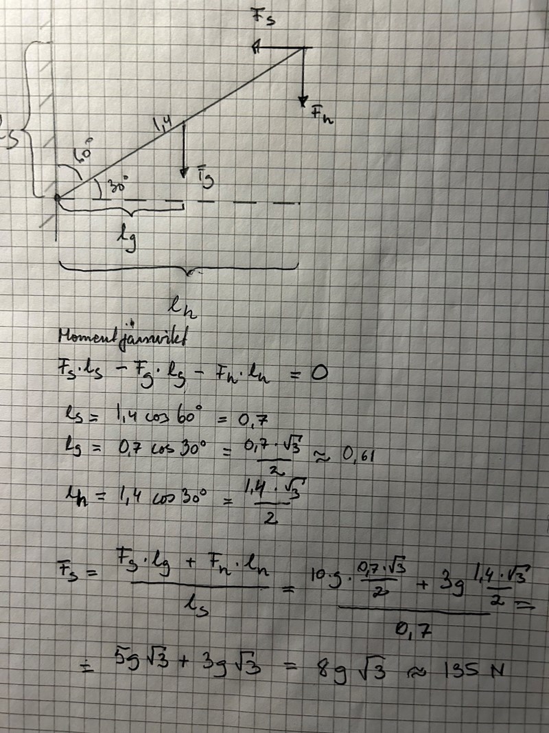 Har tyvärr inget facit till uppgiften, men om någon känner sig säker på kraftmoment, uppskattar jag gärna att ni kollar igenom mitt svar och ser om jag har rätt eller inte. Tack på förhand