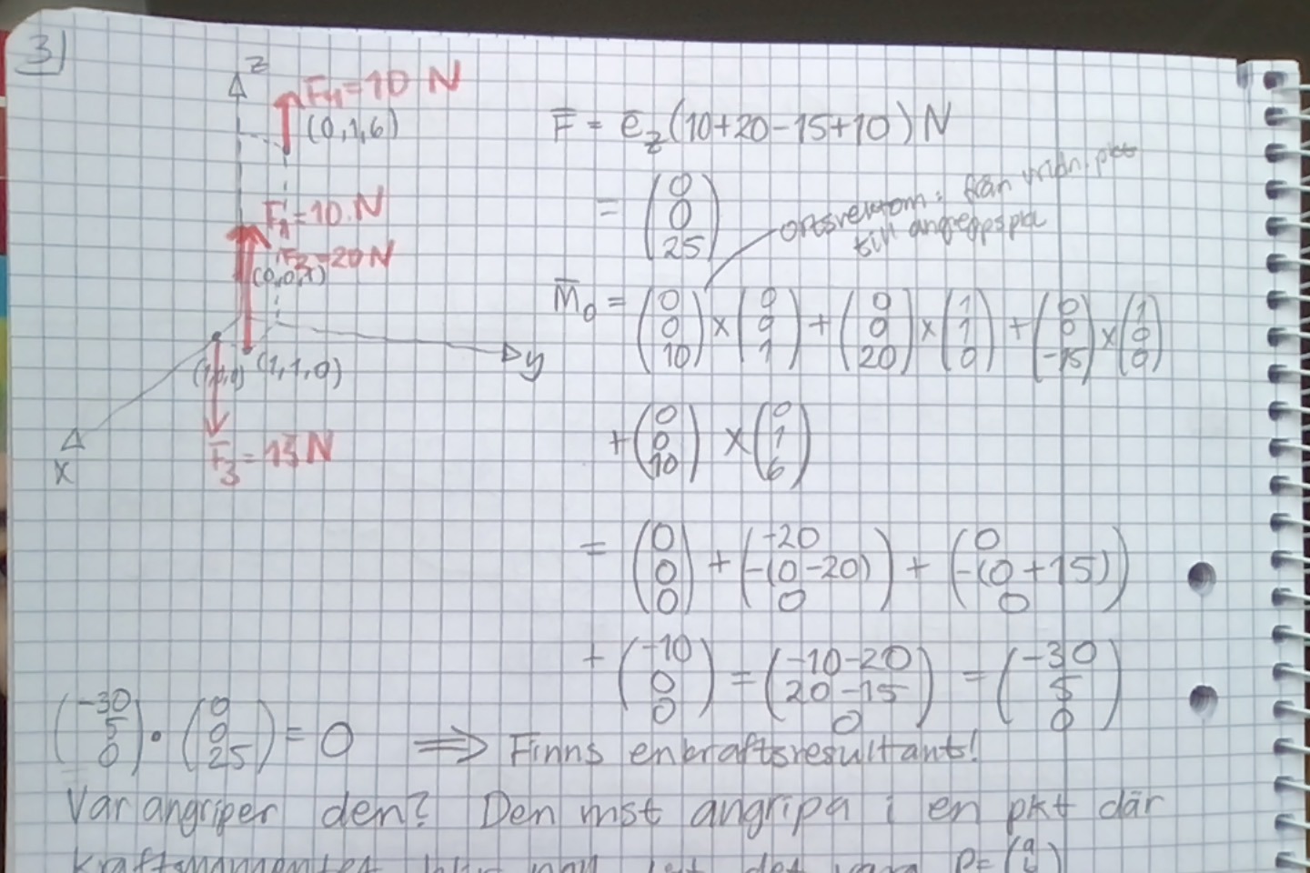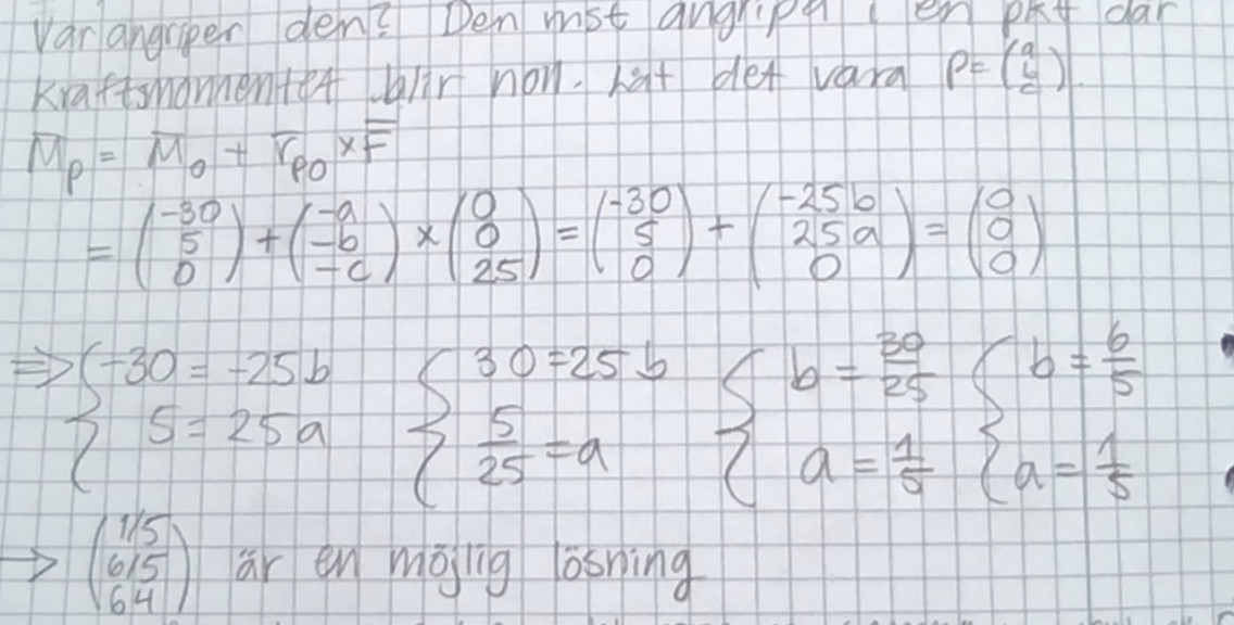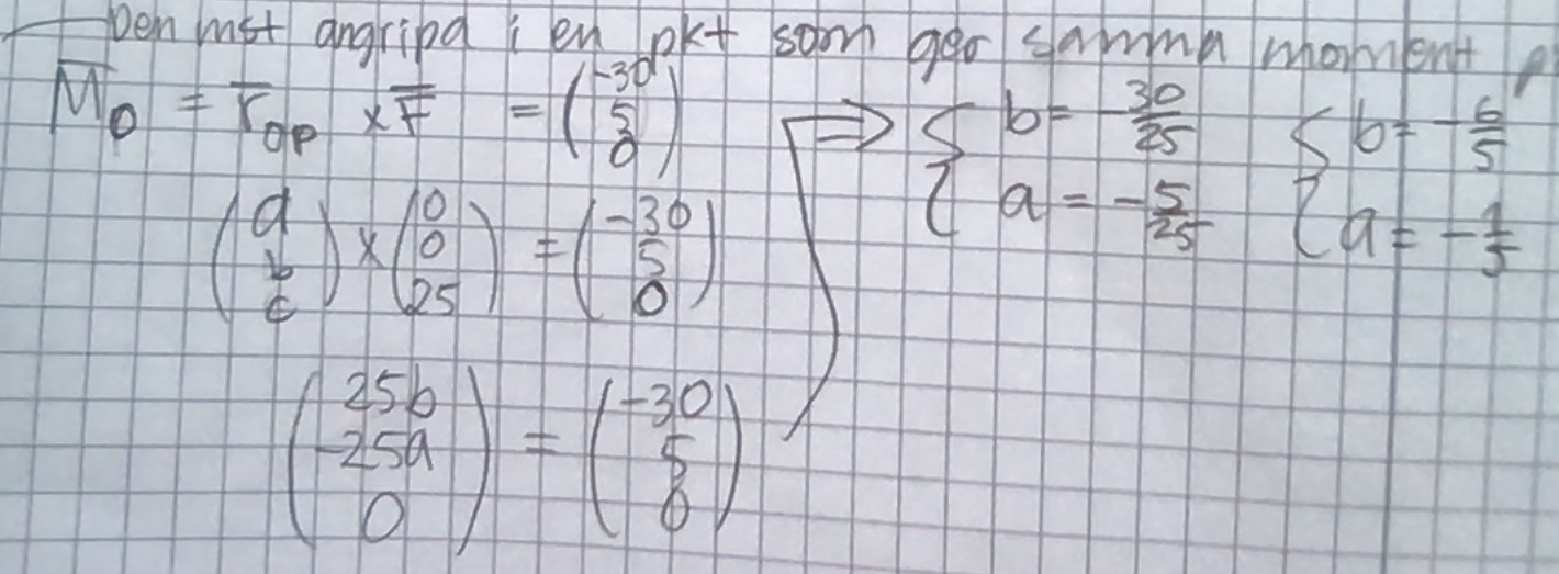 Men när jag kryssar (a, b, c) med (0, 0, 25) - som jag får som enkraftsresultanten - får jag att både a och b ska vara noll, vilket i så fall eliminerar alla alternativ?