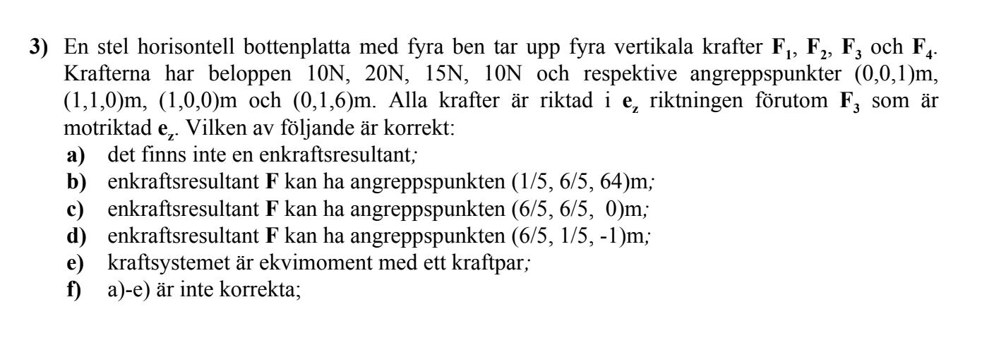Sedan försöker jag räkna ut angreppspunkten för enkraftsresultanten och får att dess x- och y-komposant ska vara noll, men enligt facit är det b som är rätt svar. Hur ska man tackla uppgiften?
