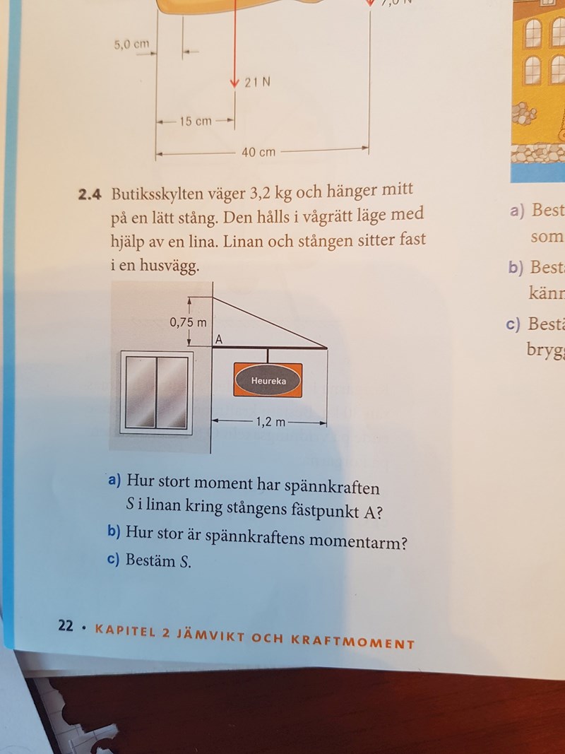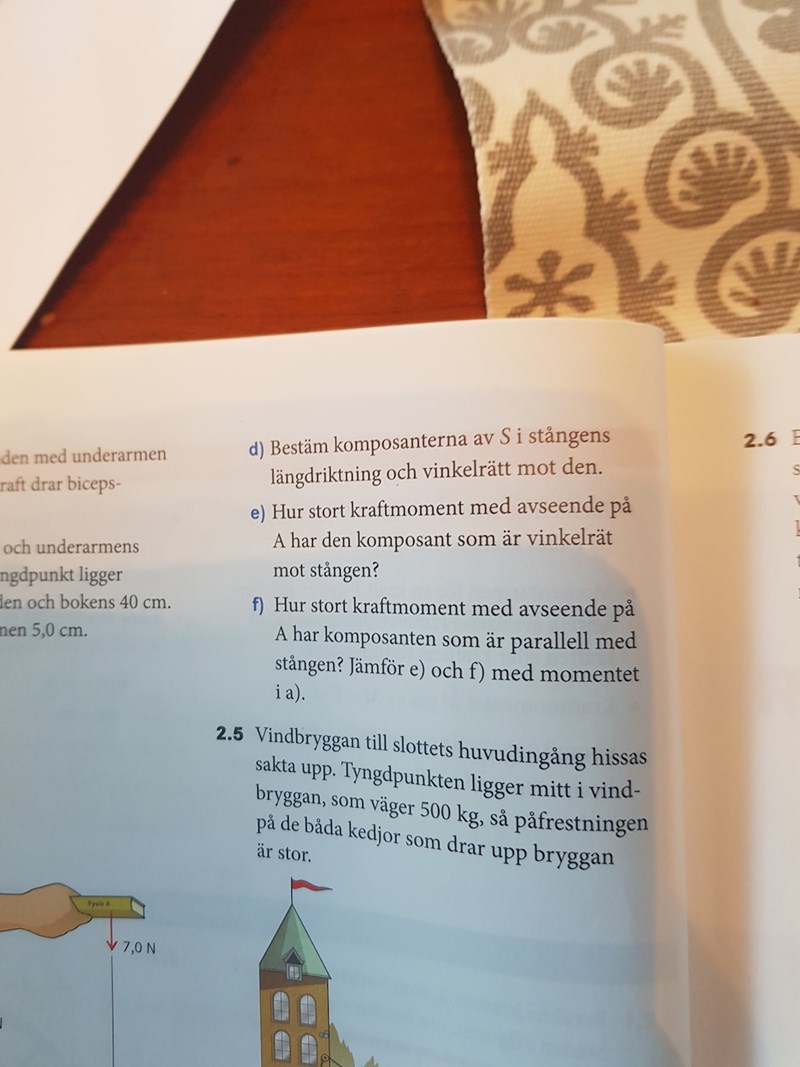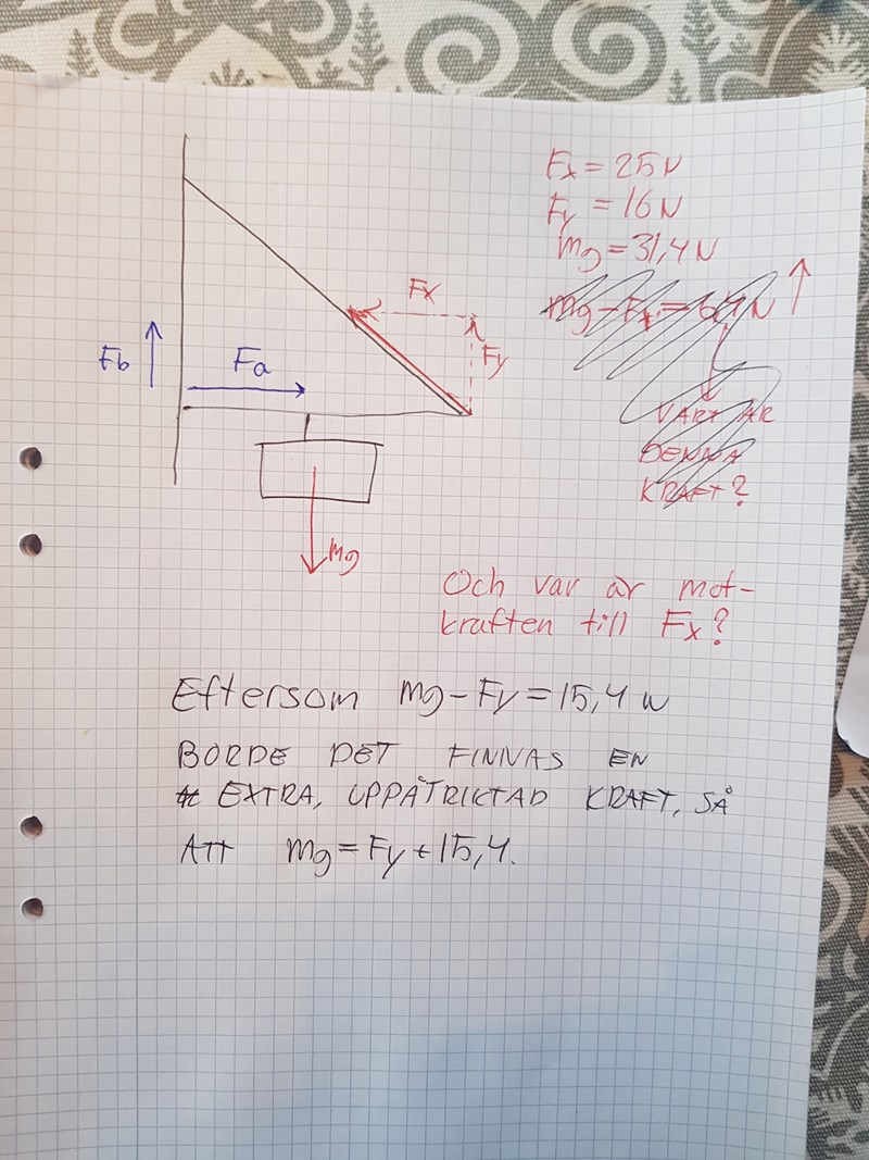 Jag skulle behöva en förklaring till ett problem som n kan se på bilden nedan. Det som är skrivet i rött är det som folk verkar använda sig av. Men om det är bara dessa krafter som existerar så kommer kraftresultanten ej vara 0 och då kan den ej vara i vila (vilket den är!). Den lösning jag kommit upp med är att det finns extra krafter (ritade i blått). Den ursprungliga frågan handlar om kraftmoment. Om dessa två krafter skulle existera så skulle de inte bidra till någon momentkraft.