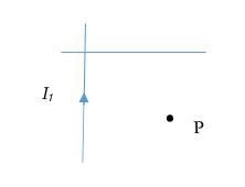 Två ledare ligger korsade enligt figuren nedan. Punkten P ligger 2,5 cm från respektive ledare. Strömmen I1 är 2,0 A. Bestäm strömmen i den andra ledaren, till storlek och riktning, om den resulterande flödestätheten i punkten P är 9,0 µT.
