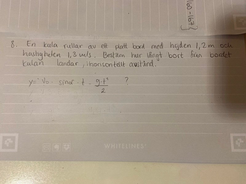 och sen det horisontella avståndet ( y = t * 1,3 m/s )