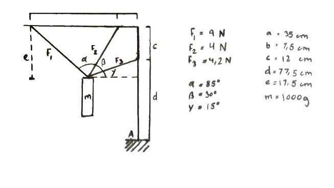 Det moment som krafterna skapar i momentpunkten A kommer alla från vikten 3 och därmed kan du räkna ut vilket moment vikten 3 skapar runt momentpunkten A, kraft gånger avstånd.