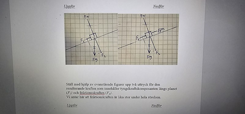 - När klossen är på väg nerför branten så är friktionskraften riktad uppför rampen.