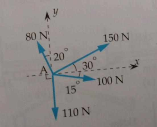 Fyra krafter i samma plan verkar i en punkt A enligt figuren. Beräkna resultantens x och y komponenter samt dess belopp.