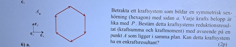 men om momentet ska bli 0 i mittpunkten av hexagonen. Hur är det tänkt att man ska ställa upp momentet för varje kraft?