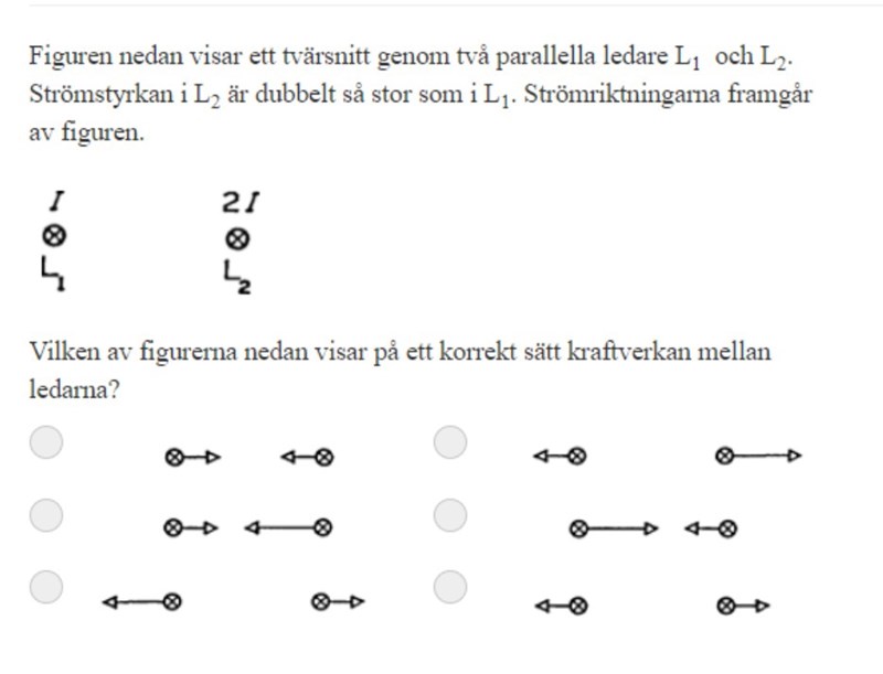 Okej. Eftersom både ledare L2 och L1 har samma strömriktning så kommer det första svarsalternativet att stämma. Dvs att det måste krafterna att riktas emot varandra. Det rätt svars alternativet bör därför vara *-> <-*