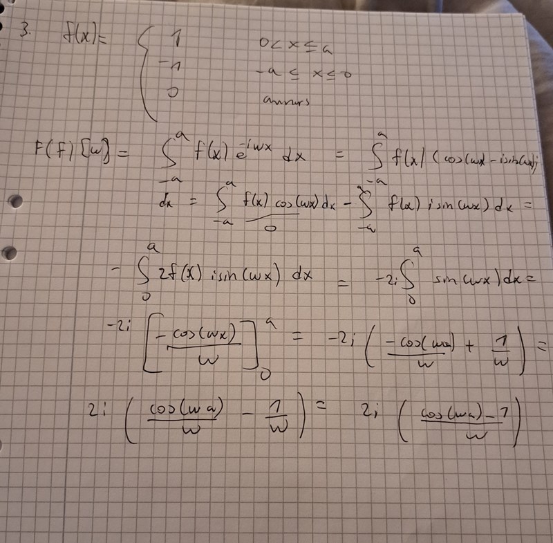 Aa ok men f är udda så blir ju fouriertransformen 0 från -a till a? Det låter som att funktionen är både udda och jämn.