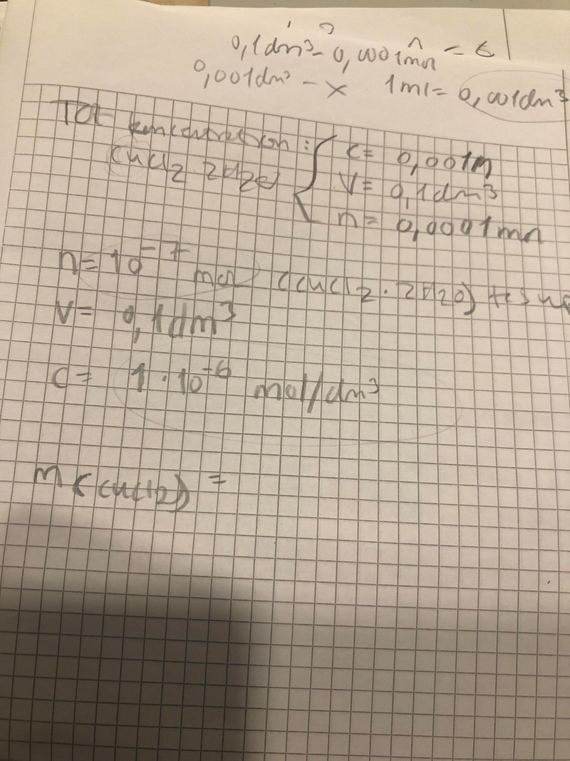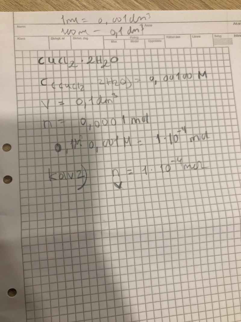 Koncentrationen i den andra mätkolven skulle vara 0,00100 mol/dm3. Kolvens volym var 0,100 dm3. Det innebär att kolven skall innehålla 0,000 100 mol.