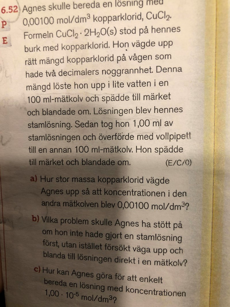 Du skall alltså framställa 100 ml av en lösning av kopparklorid med koncentrationen 0,100 mol/dm3. Hur många mol skall du väga upp? Vilken är molmassan? Vilken massa skall du väga upp?