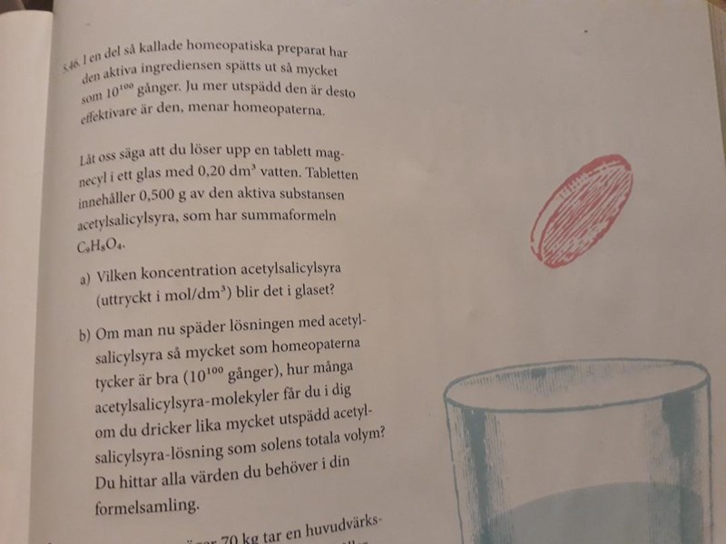 Använd formeln n = cv för att beräkna hur många mol acetylsalicylsyra man får i sig, och multiplicera sedan med Avogadros tal för att göra om det till antalet molekyler.