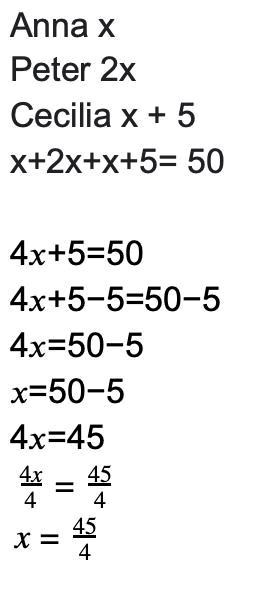 Peter är dubbelt så gammal som Anna. Cecilia är 5 år äldre ä Peter. Tillsammans är de 50 år. Bestäm deras ålder med hjälp av en ekvation