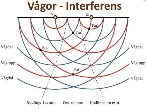 Tyckte mig ha hört att frekvenserna från två vågkällor måste vara samma för att interferens ska fungera, men att amplituderna inte behöver vara det. Men jag förstår inte vad som menas med ska fungera eftersom, om frekvensen inte är densamma från de olika källorna borde det väl fortfarande fungera, det blir ju bara inte lika ordnat blir liksom inte lika visuellt tilltalande som i bilden nedan. Dock är kan man väl fortfarande tala om konstruktiv och destruktiv interferens?
