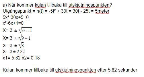 6) En kula som skjuts rakt upp kommer efter tiden t s befinna sig på höjden h m. Kulans höjd ges av funktionen h(t) = -5t2 + 30 t