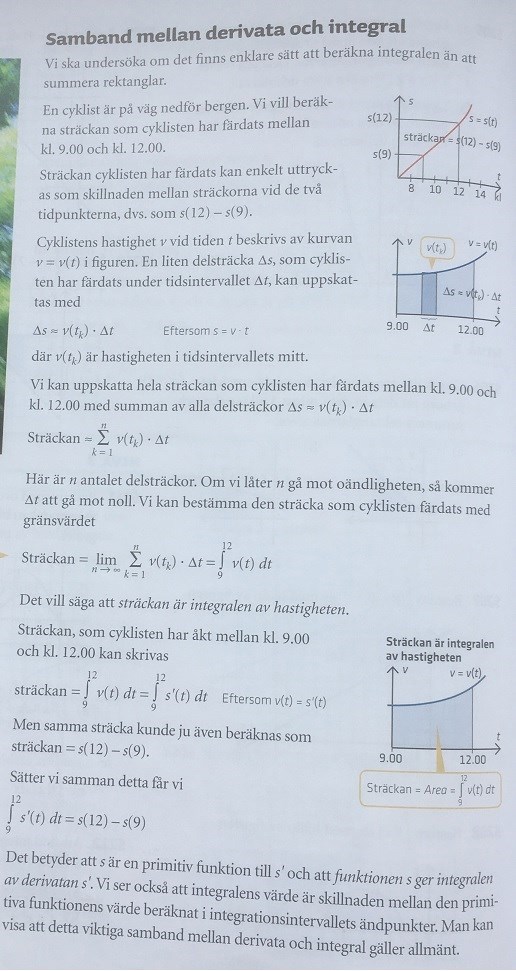 Det som du kommer att ha nytta av är om du har kläm på sambanden mellan t.ex. sträcka, hastighet och acceleration vad gäller derivata och integraler. Jag bifogar nedan en sida ur min mattebok för matte3c från serien Origo.