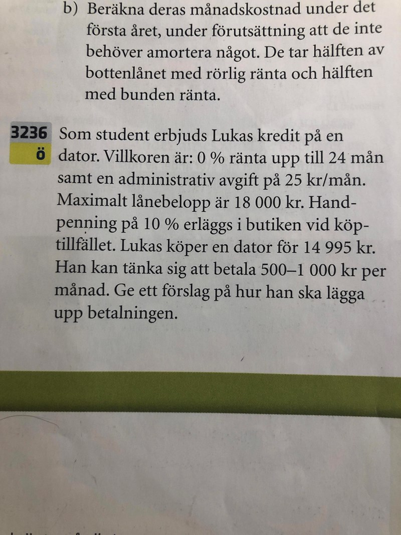 Är min uträkning också rätt?  1500kr betaldes ju på plats så lånet blir 14995-1500=13 496kr.