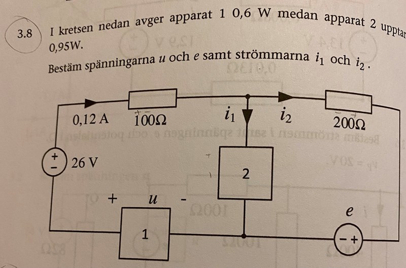 Såhär blir det väll för spänningen u 26-100•0,12+200i2-e+u=0 Hur ska jag då lösa u när jag har så många obekanta?