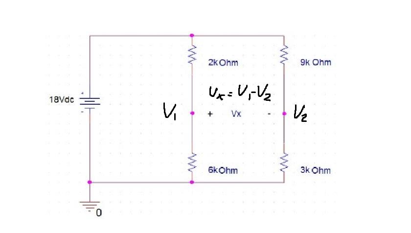 Jag tänker såhär: V1 är mellan 2k ohm och 6k ohm. Och om vi potentialvandrar: -18V + 2k *I1 + 6k*I1 = 0. Om vi vill veta hur mycket som finns innan 6k ohm resistorn och efter 2k ohm resistorn borde det väl bara vara differensen: V1=2k*I1 - 18V.