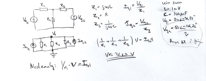 3. "den stora frågan": När jag gör Node-voltage vid v0 så antar jag att jag behöver göra om vg1 o vg2 till ett komplext tal så att jag kan få v0 = a+bi.., är det då rätt att sätta upp ekvationsystemet(se figur), eller finns det ett super obvious sätt jag missat i hasten?