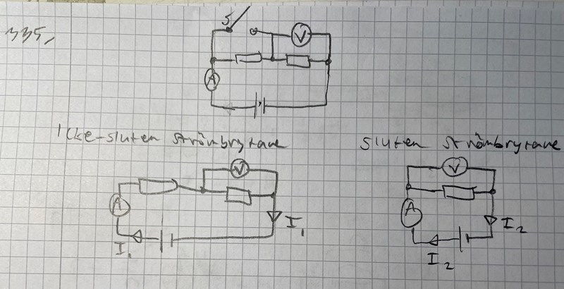 Ingen aning, jag tänkte på ohms lag U = RI , men i ett tidigare inlägg jag postat så blev jag tillsagd att INTE använda den lagen för att dra slutsatser (t.ex. om resistansen ökar, så ökar det osv.). Däremot så kanske man ändå kan använda ohms lag, eftersom det inte finns något inre resistans i spänningskällan (det nämns iallafall inte något om en inre resistans). Vi vet att U=E-RinreI men R(inre) = 0, d.v.s. U = E och således beror U på varken strömmen eller resistansen. När det totala motståndet minskar så påverkas alltså inte polspänningen, vilket betyder att det kvarblivande motståndet (figur till höger) får all spänning över sig, d.v.s. voltmeterns utslag ökar?