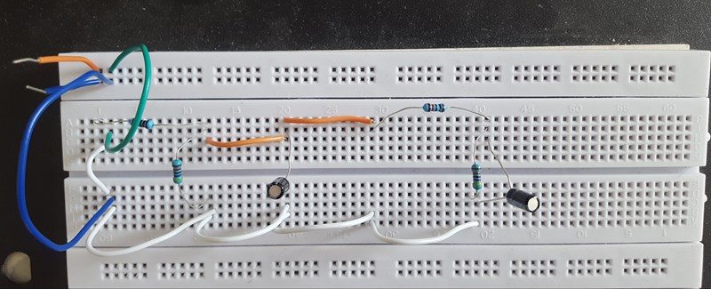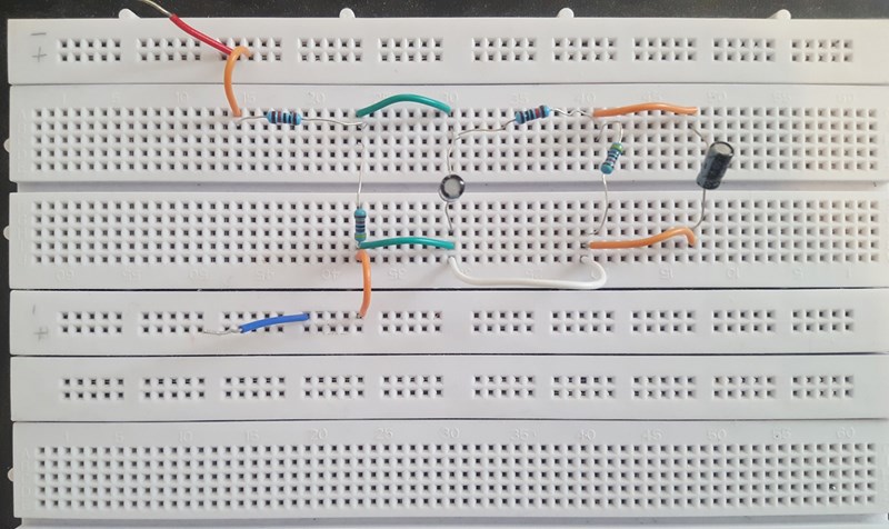 Jag försöker koppla upp denna krets på kopplingsbordet för att mäta spänningen i punkt A och B.