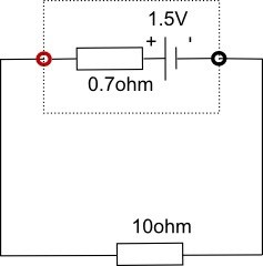 Symbolerna man använder i kretsschema föreställer "ideala" komponenter. Dvs spänningskällor med noll i inre resistans och ledningar med noll resistans. Här har du ett batteri med den inre resistansen 0.7ohm.