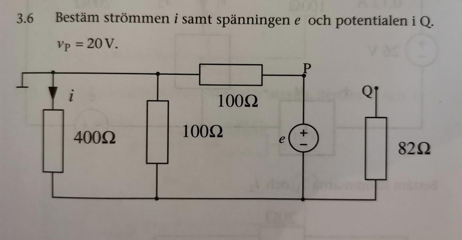 i = 20 / (400 + 100) = 0.04 A (korrekt svar enligt facit)