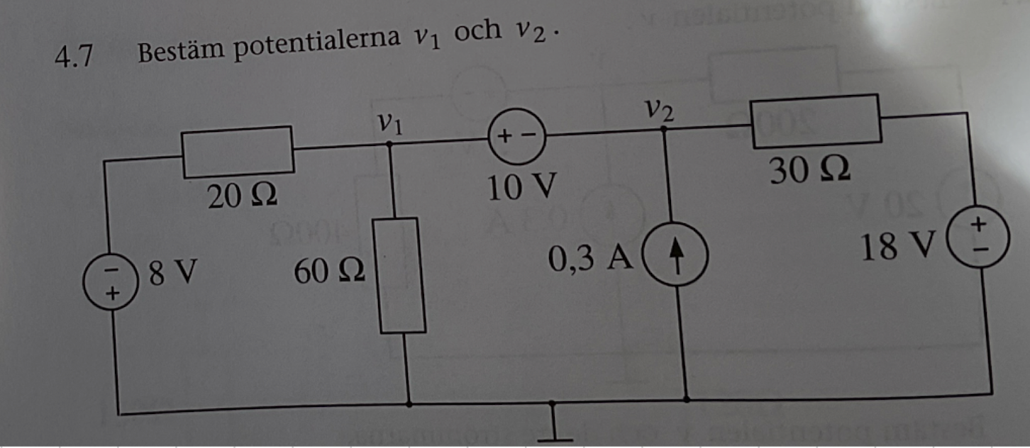 Är det någon kunnig som ser hur man bör gå tillväga för att få samma svar som i facit? Uppgifterna fokuserar på analysmetoder, mer specifikt nodanalys. Kretsen är jordad längst ner i figuren.