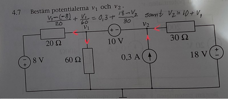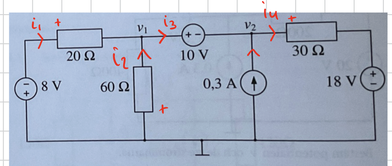 Strömriktningarna är antagna som de röda pilarna indikerar. Summa ström in till 10 V spänningskällan är då lika med summan av strömmarna ut därifrån. Potentialen på högersidan om 30 ohms resistansen är +18 V och på vänstersidan v2, så med antagen strömriktning är den (18-v2)/30 ampere.