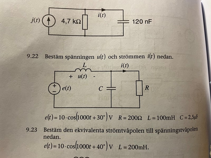 Hej, jag har verkligen fastnat på den här uppgiften, 9.22. Jag vill göra en nodanalys i den övre noden och få nodpotentialen, för att sedan få ut alla strömmar och därmed även spänningen över spolen. Men jag lyckas inte få till det. Skulle verkligen uppskatta tips på hur man ska tänka här.