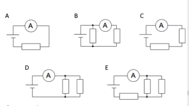 Beräkna ersättningsresistansen för de olika kretsarna (utom B, där inte hela strömmen går genom amperemetern - kretsarna B och D är likadana, förutom var amperemetern är placerad).