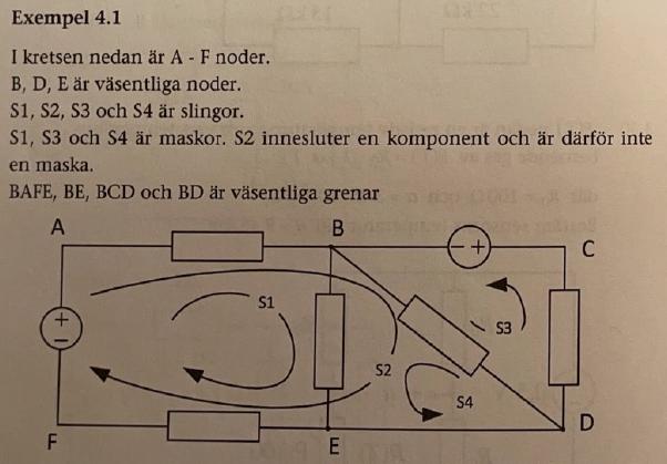 Läser på universitet men tror denna fråga hör hemma i gymnasiefysik därav valde jag Fysik 1. Hur som helst. En väsentlig nod enligt boken är en punkt i nätet där tre eller fler kretselement är förbundna med varandra. Min första fråga är, när vi säger kretselement, ingår spänningskällor då? Och varför är E en väsentlig nod? Enligt mig är det bara två kretselement (två resistorer), kanske ska räkna med spänningskällan?