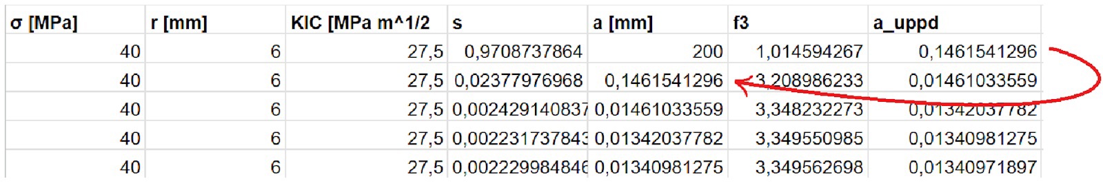 så jag skriver att instabil spricktillväxt sker när KIKic och att vi ställer upp därav villkoret att KI=KIC, alltså när KI-KIC=0 har vi hittat en lösning. Så provar jag fram tills att jag hittar ett värde som är tillräckligt nära 0 och får då en lösning.