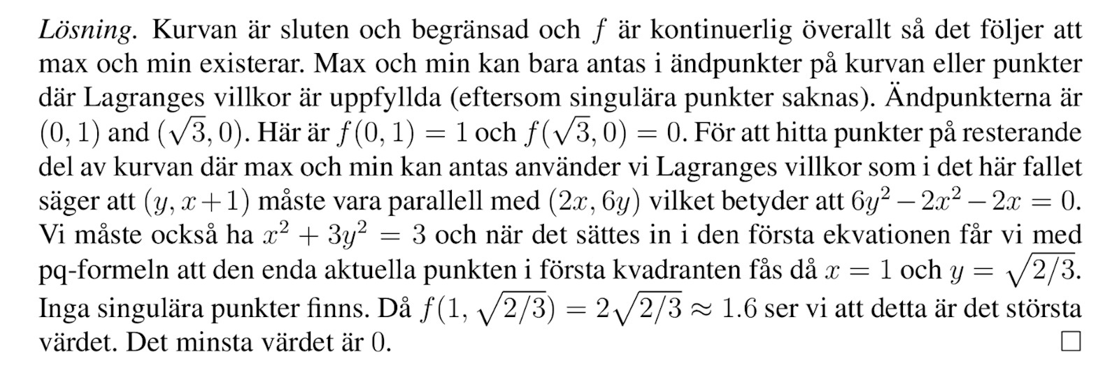 Hej. Jag förstår ej hur de får fram dem stationära punkterna på denna fråga, jag hittar inga punkter som uppfyller de två villkoren. Enda punkten som jag ser som uppfyller gradienten av f(x,y) = (0,0) är (0,-1), vilket ej uppfyller andra villkoret.
