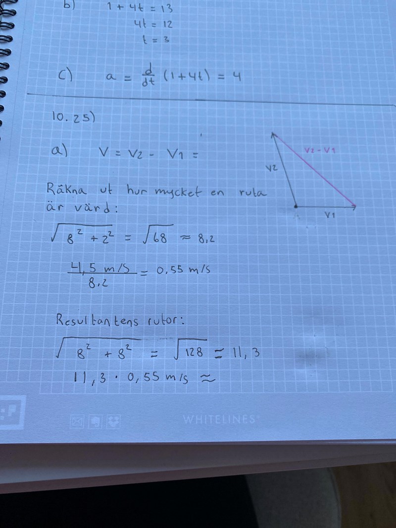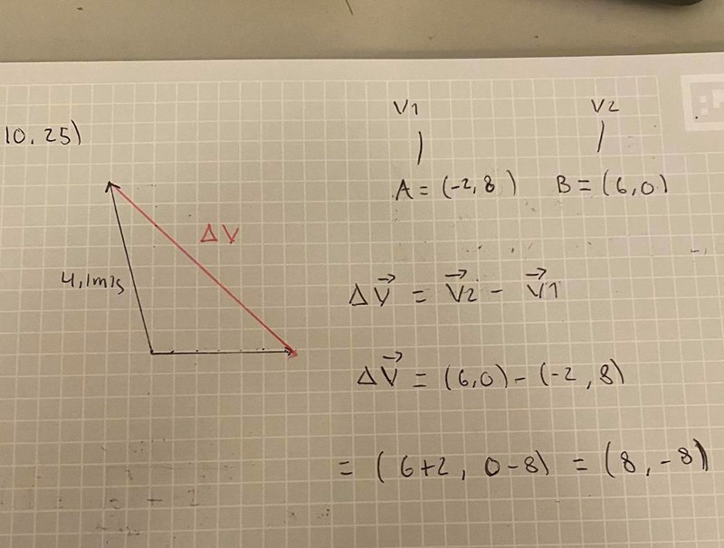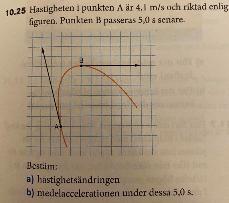 Hej, jag har försökt lösa denna uppgift ett tag nu men jag får inte fram hastigheten för vektorn B. Jag vet att man får fram hastighetsändringen genom att ta v= v2-v1. Jag har även försökt på flera olika andra sätt som att räkna fram sekantens lutning mellan a och b men tror inte man ska göra så. Tacksam för hjälp hur man löser uppgift a.