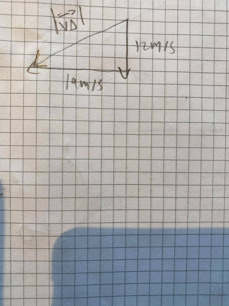 En ishockeypuck glider rakt söder på en ishockeyrink med farten 12m/s. Efter ett klubbslag, som påverkar pucken under 0,11 s, fortsätter pucken rakt åt vänster med farten 19m/s. Beräkna puckens medelacceleration under klubbslaget. Varför blir det fel att rita på detta sätt? ( riktningen på | v-vo| stämmer inte )