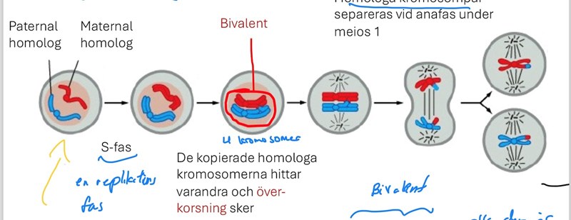Hej, om en haploid cell har 23 kromosomer så betyder det att i cellen på bilden där jag har markerat, att den har 46 kromosomer ? Men varför ritar de bara 2 kromosomer