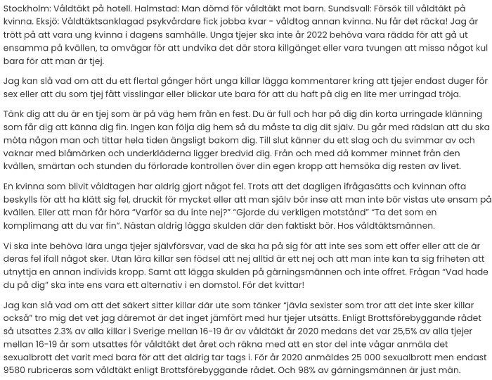 Hej! Vi skriver just nu krönikor och själv skriver jag om våldtäkt. Vill gärna ha folks åsikter kring det jag skrivit samt hur jag kan fortätta och även en potenciell titel.