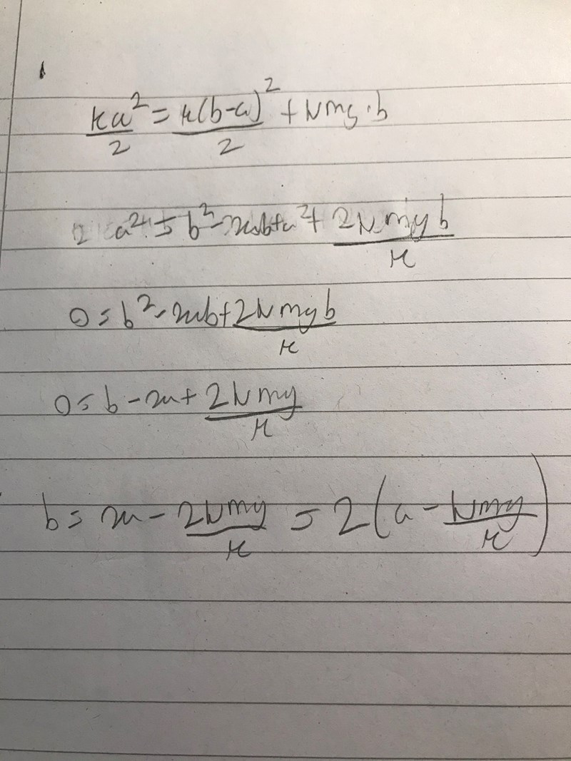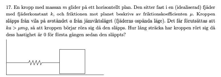 Beräkningen är kanske otydlig so sorry. I början har fjädern en total energi vilket fås ur formeln (kA^2)/2 där A = a dvs amplituden. När fjädern väl släps kommer den röra sig ett visst avstånd (vi kallar för b). Då kommer den totala energin ha omvandlats till friktion arbete samt potentiell energi i fjädern. Friktionarbetet fås genom friktionskraft * sträcka det vill säga normalkraft * friktionskoefficient * b. Potentiella energin fås genom att ersätta A med (b-a) dvs sträckan som färdats. Sedan löser du ut b genom att först multiplicera med 2/k i båda led.