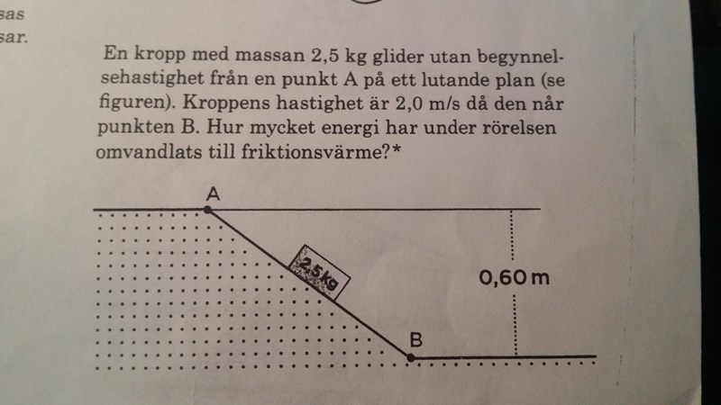 Du vet att lägesenergi ges av ekvationen : där du har ett värde på alla variabler (massan är given, höjden är given och tyngdaccelerationen är given). Sätt nollnivån i punkten B, där har kroppen ingen lägesenergi.