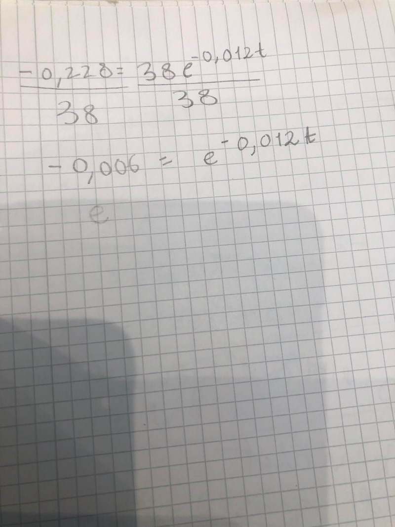 Jag skriver 19=38*e^-0.012t