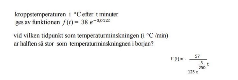 Uppgiften är att man skall ta reda på vid vilken tidpunkt som temperaturminskningen (i oC/min) är hälften så sor som temperaturminskningen i början, om kroppstemperaturen i oC efter t minuter ges av funktionen f(t) = 38e-0,012t.