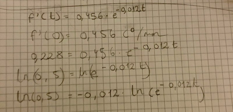 Då är ekvationen vi vill lösa f'(t) = ½f'(0). Du har beräknat att f'(0) = -0,456e-0,012*0 = -0,456 oC/min.