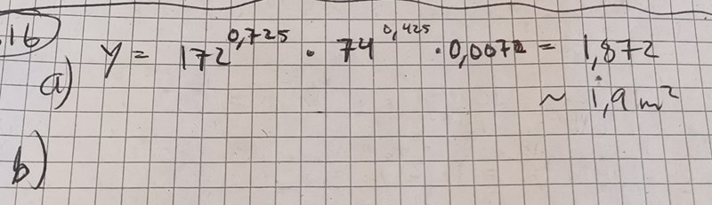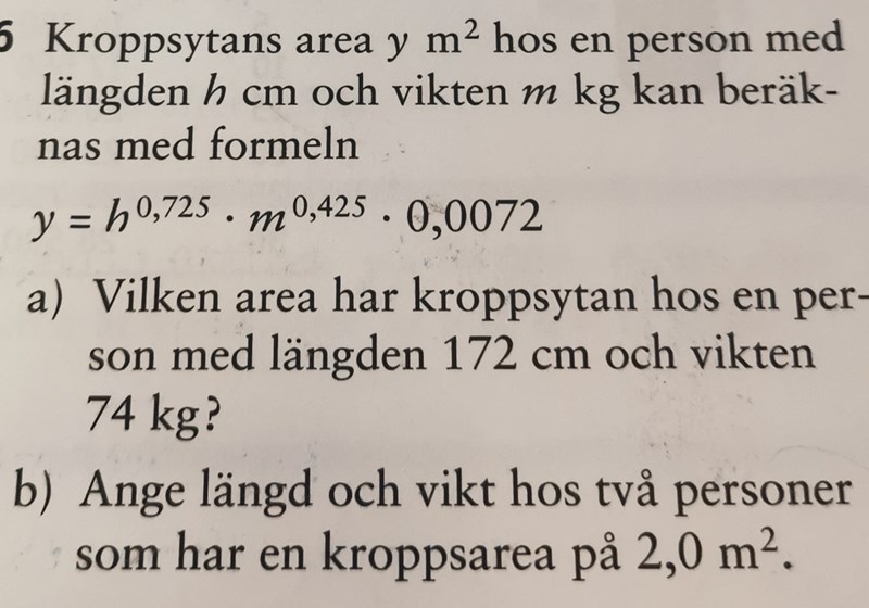 Det måste finnas något mer villkor i b) annars får du två obekanta och en ekvation. Då kan du bara ge exempel på personer som har den arean. Tex anta en längd eller en kroppsvikt.